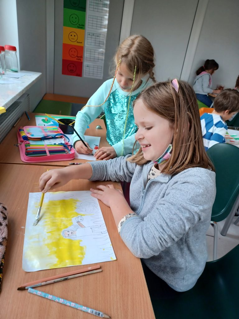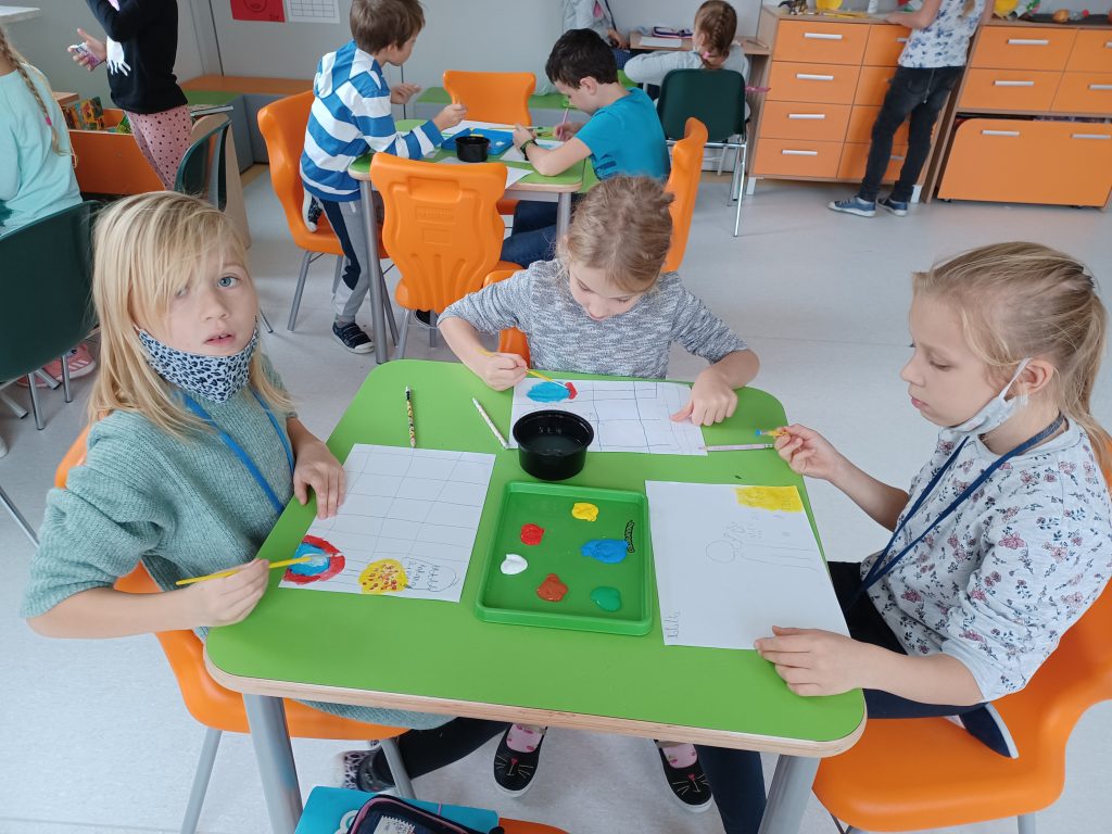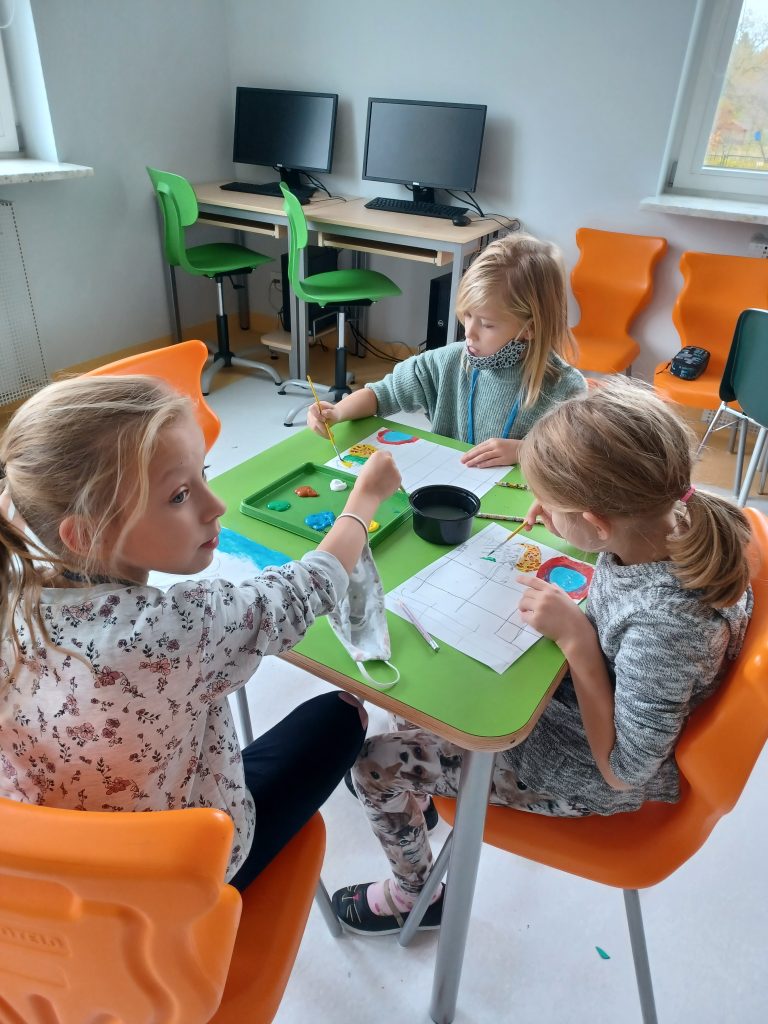 z klocków. Samodzielnie mieszali kolory podstawowe aby uzyskać kolory pochodne. Następnie w grupach malowali duży obraz pt.: „Wiosenna łąka” wykorzystując samodzielnie uzyskane kolory. Drugie zajęcia zapoznawały uczniów z tematyką rzeźby. Dzieci uczestniczyły w zabawie ruchowej: żywa rzeźba. Następnie samodzielnie wykonały rzeźby z folii aluminiowej przedstawiające ludzi lub zwierzęta. Ostatnie zajęcia były związane ze sztuką prehistoryczną. Uczniowie wysłuchali historii odkrycia jaskini w Lascaux. Obejrzeli film przedstawiający malowidła naskalne. Na koniec uczniowie wykonali w grupach rysunki na dużych arkuszach szarego papieru przedstawiające naskalne ryty.