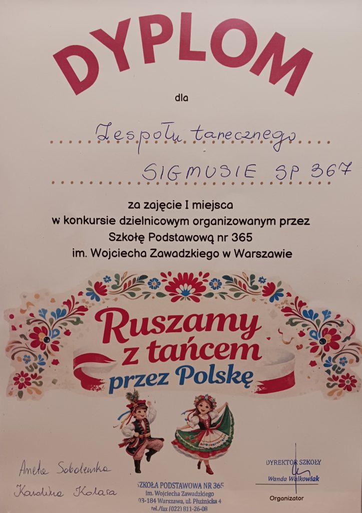 W dniu 14 kwietnia 2026 roku odbyła się pierwsza edycja ww. konkursu. Był to dzień szczególny dla organizatorów i uczestników konkursu, ponieważ tego samego dnia w roku 966 odbył się Chrzest Polski. Uczniowie pięciu szkół podstawowych z dzielnicy Białołęka, uczcili to wydarzenie prezentując polskie tańce narodowe. Uczniowie naszej szkoły – klasa 2C – włożyli ogrom pracy, aby opanować układ choreograficzny Krakowiaka zaproponowany przez wychowawcę na jak najwyższym poziomie. Dzięki wytrwałej współpracy chłopców z dziewczętami, stworzyli niemalże profesjonalny zespół „ Sigmusie”, oparty na współpracy i wzajemnym zaufaniu. Stroje przygotowane przez rodziców uczniów, dodały występowi niesamowitego kolorytu i charakteru.
